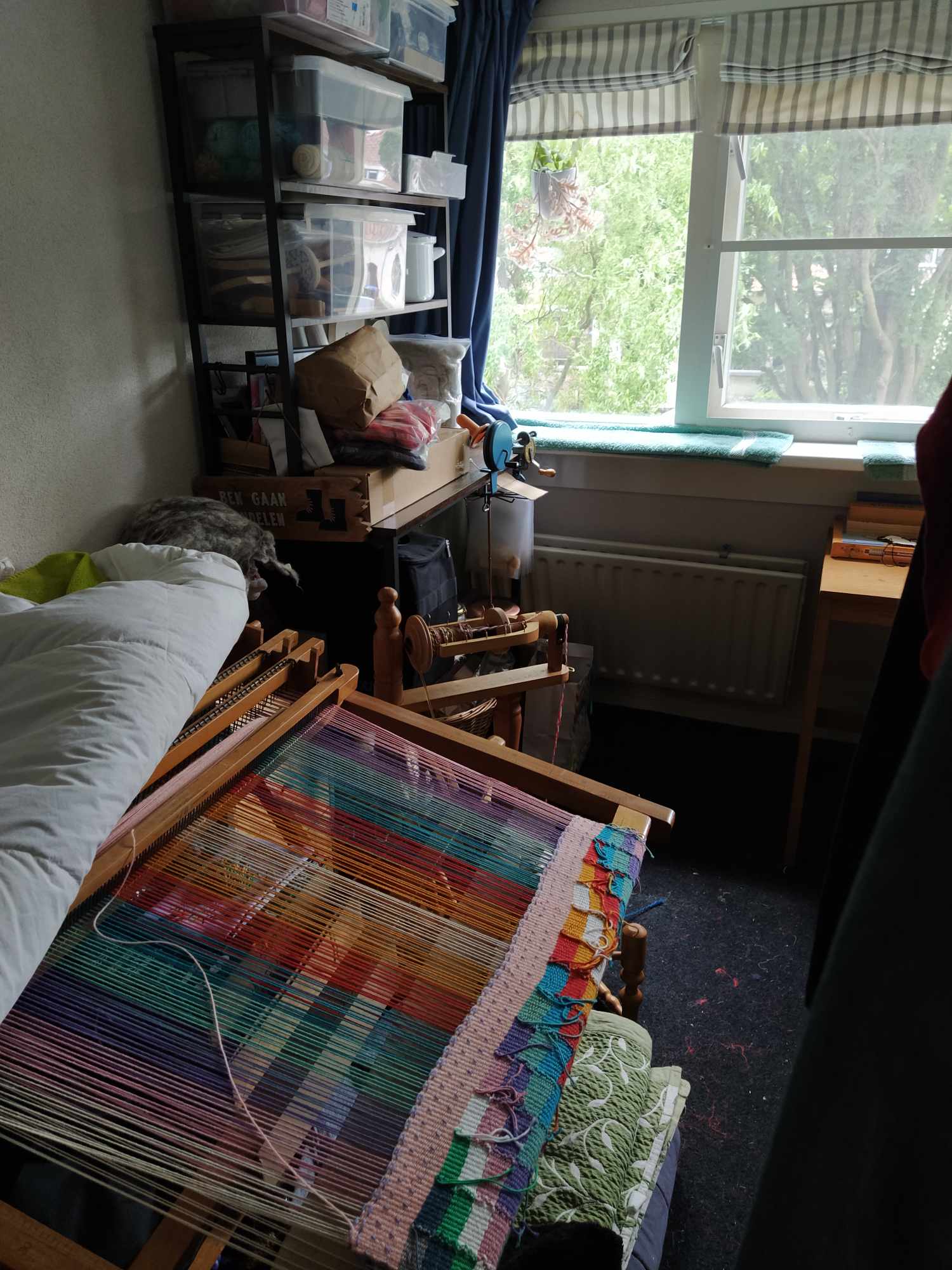 Ik volg mijn hart en de ideeën komen vanzelf omhoog. Maar ook de verhalen van andere mensen of suggesties geven leuke ideeën. Zo heb ik afgelopen najaar diverse kleuren Merino wol gesponnen en er een sjaal van geweven in opdracht van een vriendin(buurvrouw).